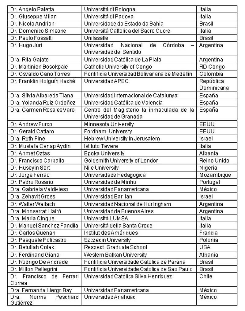 Comité de Difusión Pedro Beltrán Santiago, Cátedras Scholas México Maya González Bender, Universidad ISALUD, Argentina Silvana Bragatto, Instituto Casa Común, Brasil Cleia Zanatta, Universidade de Petropolis, Brasil Tânia Maria Hetkowski, Universidade do Estado da Bahia, Brasil Juan Carlos Torre Puente, Centro Universitario ESCUNI, España Caren Rodrigues, St Joseph institute of Management, India Mariola Kozubec, Silesia University, Polonia Edimer Albeiro Pardo Flórez, Universidad La Gran Colombia Elsa María Moquete Cruz, República Dominicana Lazare Rukundwa Sebitereko, Eben Ezer, University, RD Congo